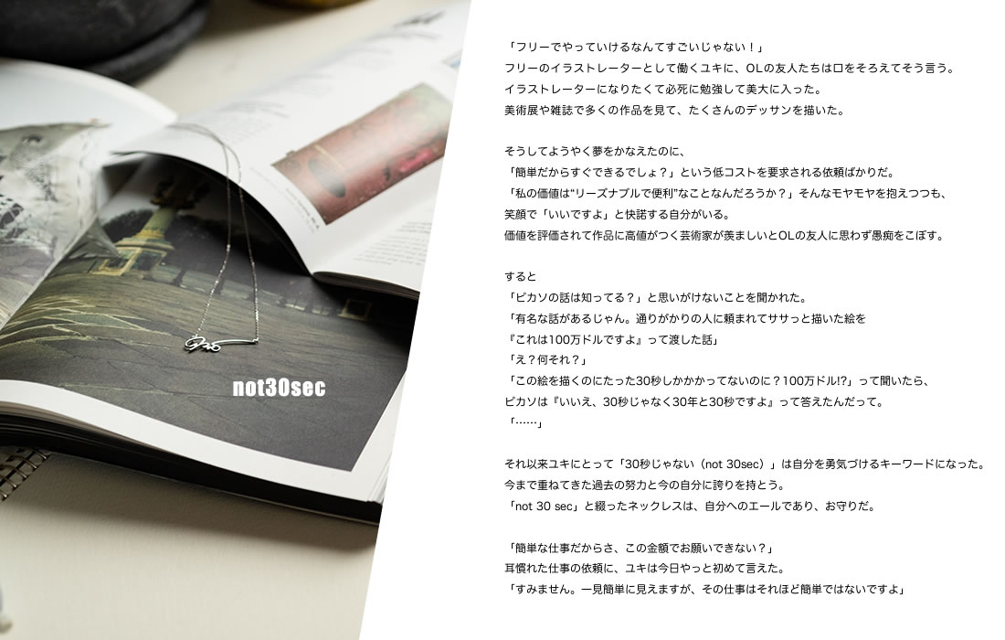 「not 30 sec」と綴ったネックレスは、自分へのエールであり、お守りだ。