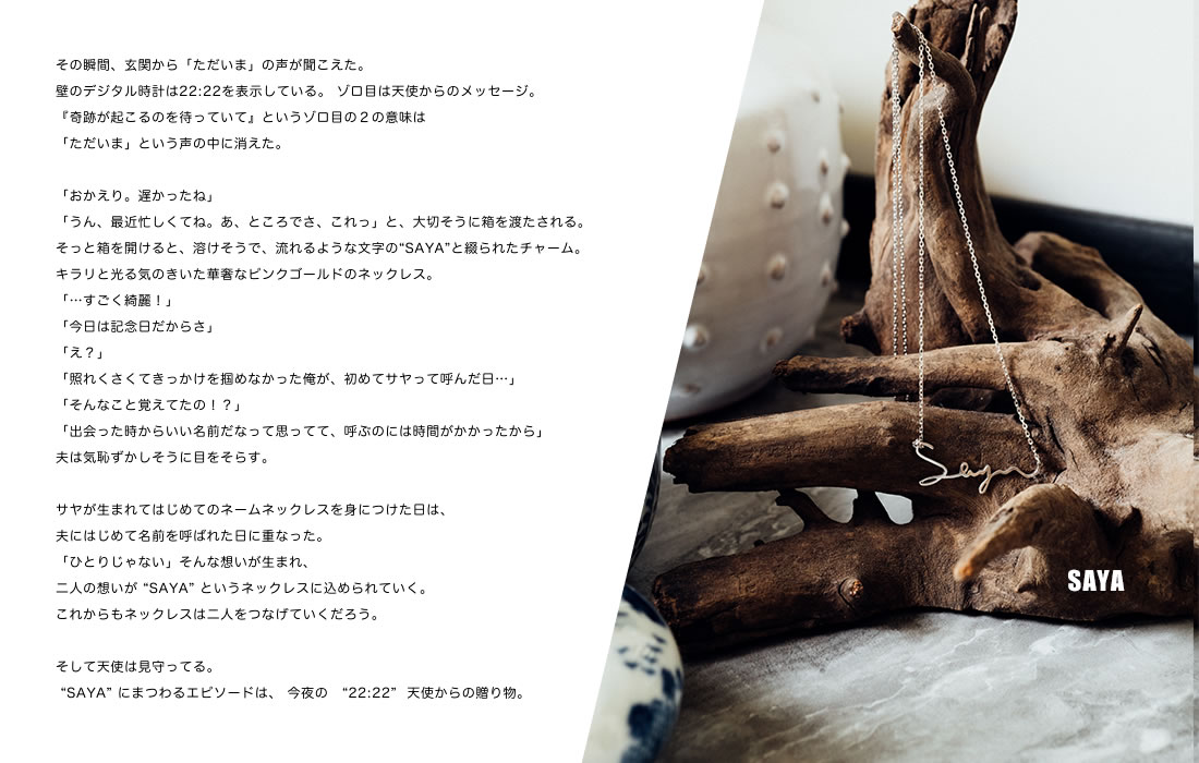 大切な言葉を常に肌で感じていられるよう、どんなシーンやスタイルにもすんなりなじむシンプルなデザインに仕上げました。シンプルさと唯一無二が同居する、新感覚のジュエリーです。